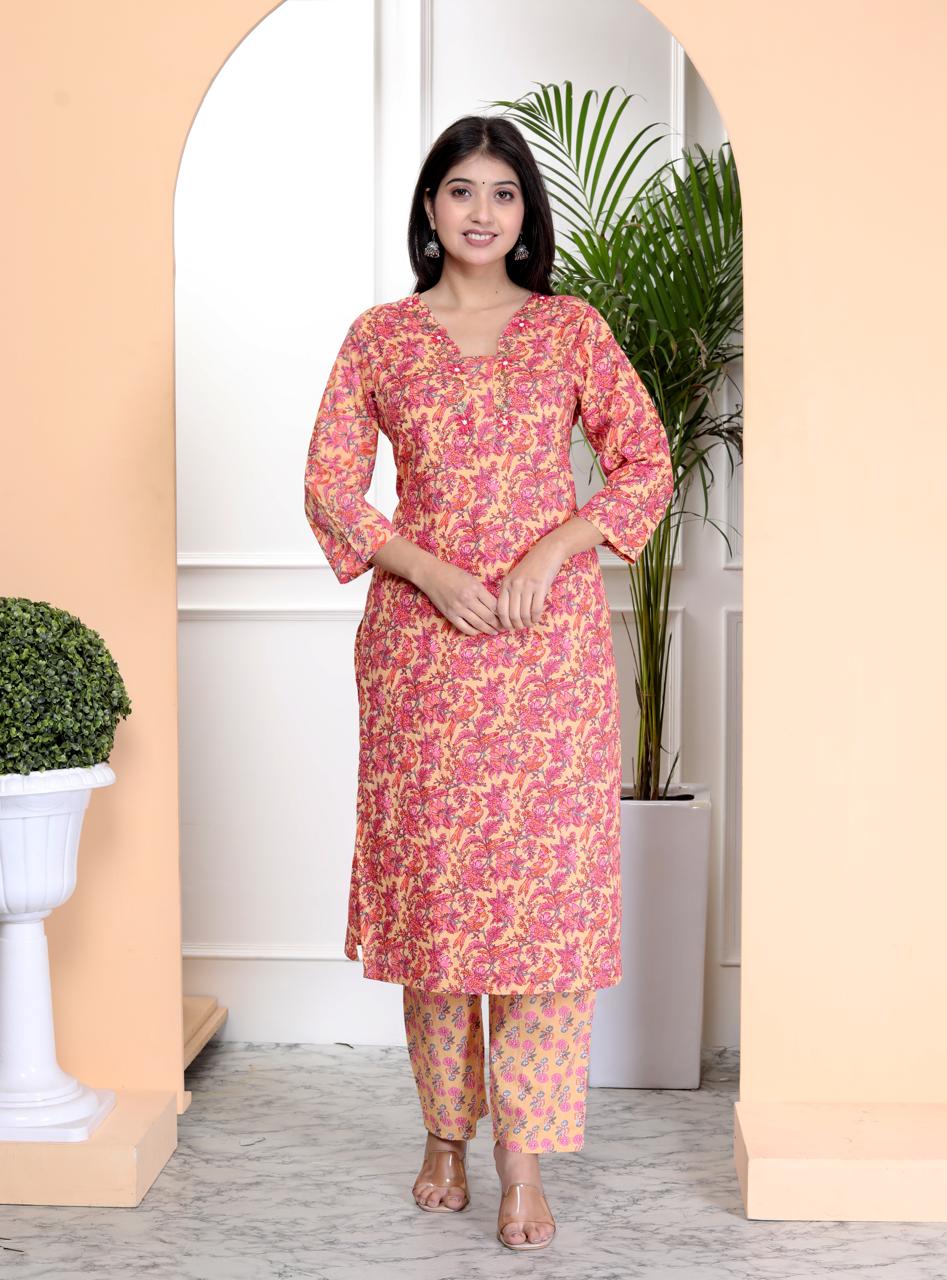 COTTON PRINTED KURTI SET, YELLOW COLOUR