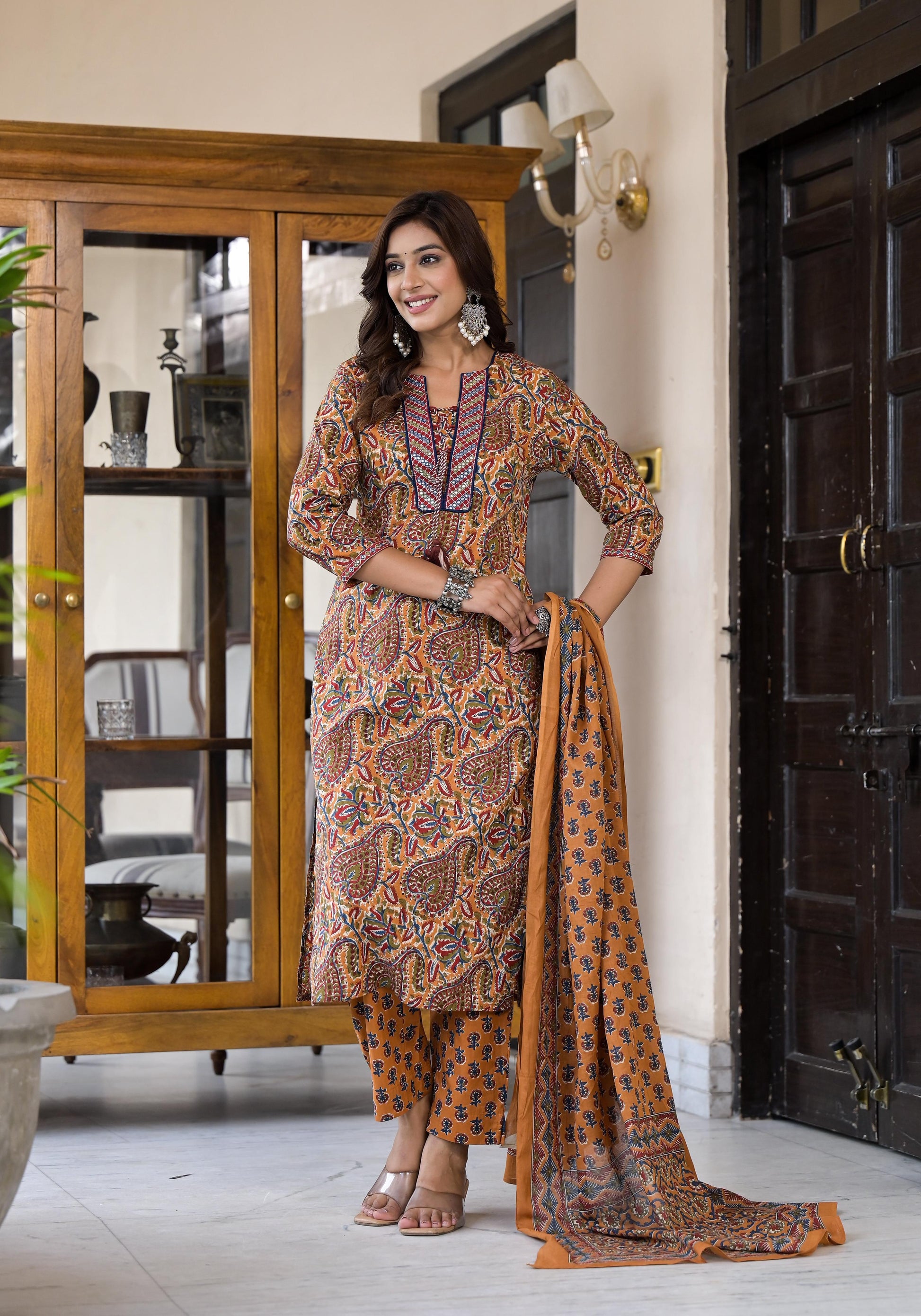 PURE COTTON PRINTED KURTI SET WITH MIRROR AND THREAD WORK ON THE YOKE PORTION.