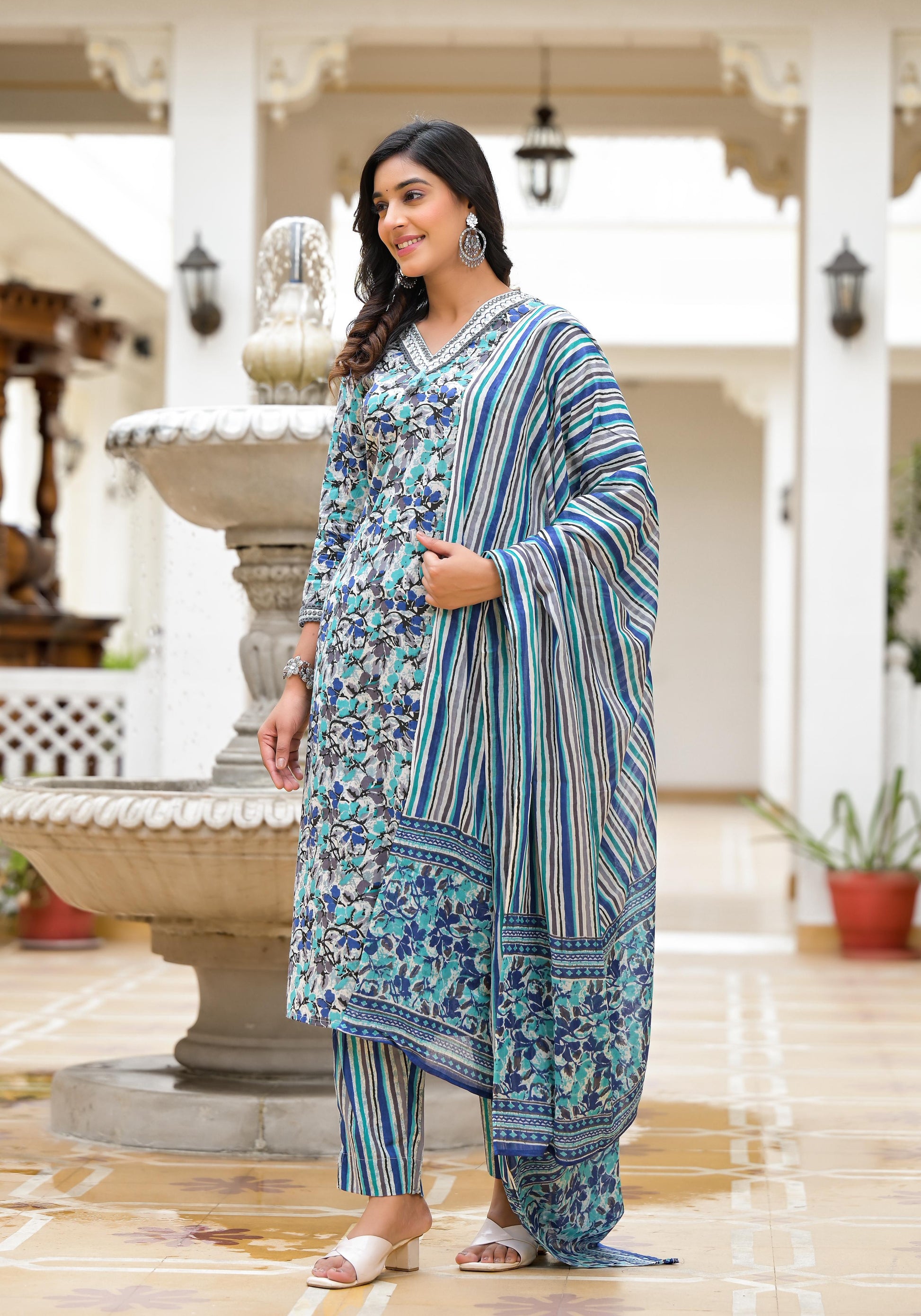 PURE COTTON PRINTED KURTI SET WITH CROCHET LACE AND MIRROR WORK ON THE YOKE PORTION AND SLEEVES.