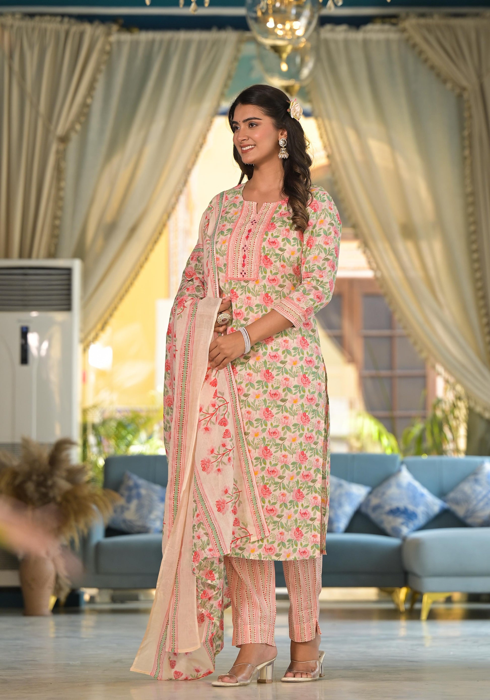 COTTON PRINTED KURTI SET WITH LACE AND MIRROR WORK ON THE YOKE PORTION.