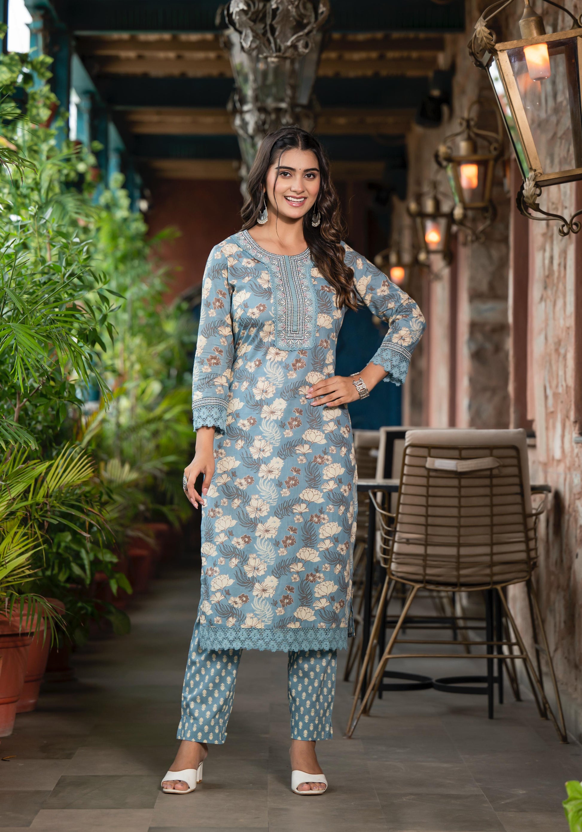 PURE COTTON PRINTED KURTI SET WITH CROCHET LACE AND EMBROIDERY WORK ON THE YOKE PORTION. CROCHET LACE WORK ON THE SLEEVES AND KURTI BORDER.