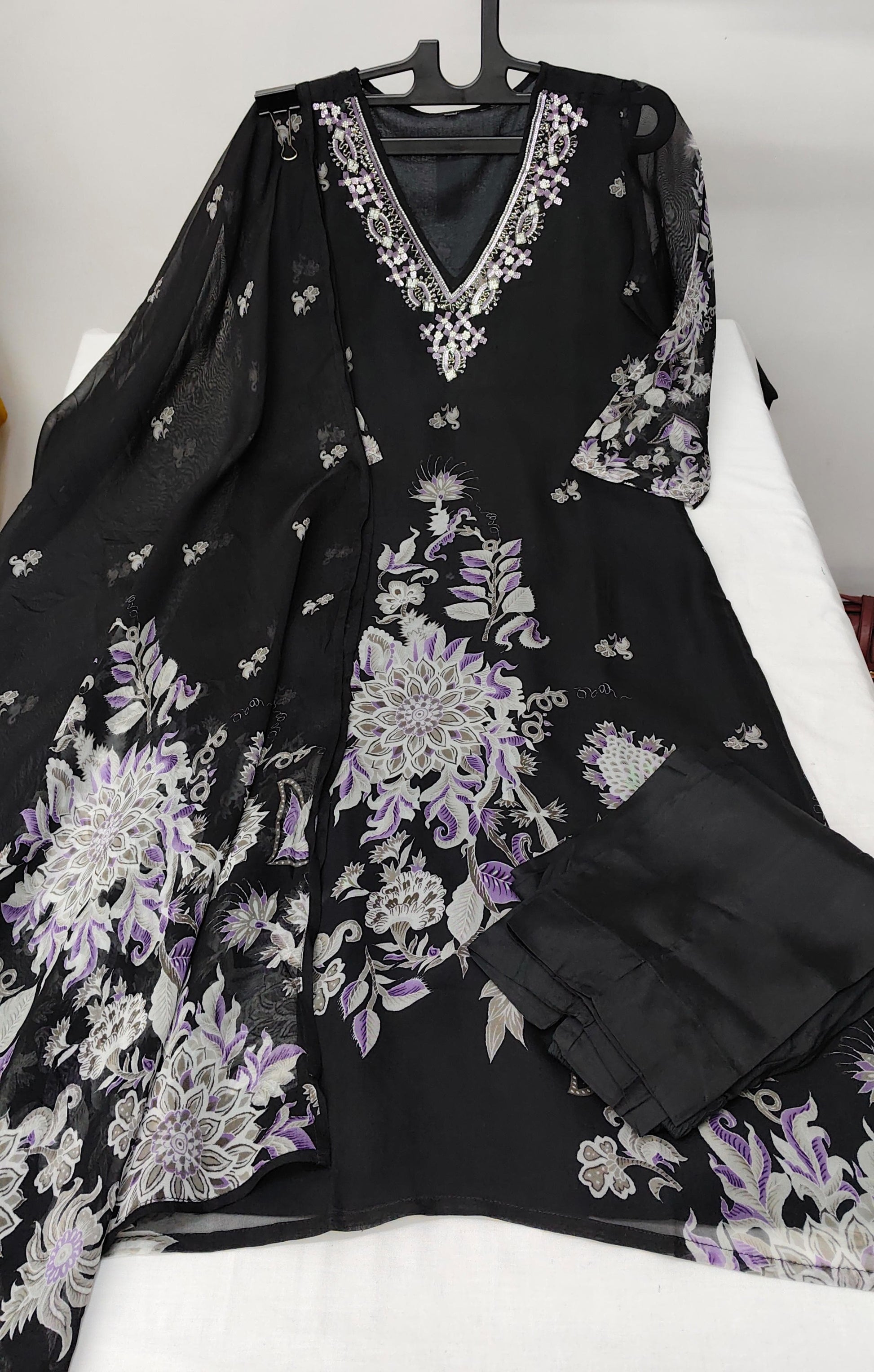 ORGANZA PRINTED KURTI SET WITH BEAUTIFUL HANDWORK ON THE YOKE PORTION, COLOUR - BLACK